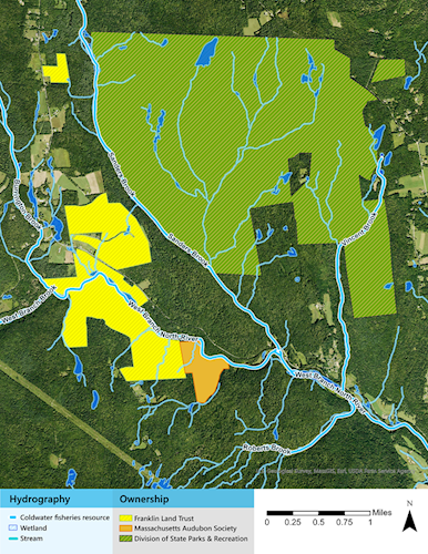 In the Deerfield River watershed of western Massachusetts, wild brook trout populations depend on small headwater streams and the forested landscape which provide these streams with shade, nutrients, and hydrological stability. Since the Deerfield Rivershed is dominated by private land ownerships, to effectively manage the small headwaters and forested catchments that support the region’s wild brook trout these private landowners must be engaged. By identifying areas where stream health and silvicultural goals align and equipping foresters and landowners with the tools needed to work at these intersections. MA Woodlands Institute and Franklin Land Trust hope to draw the attention of private landowners to a novel wildlife habitat interest, stimulate the local forest products economy, and enhance the resilience of wild trout population.